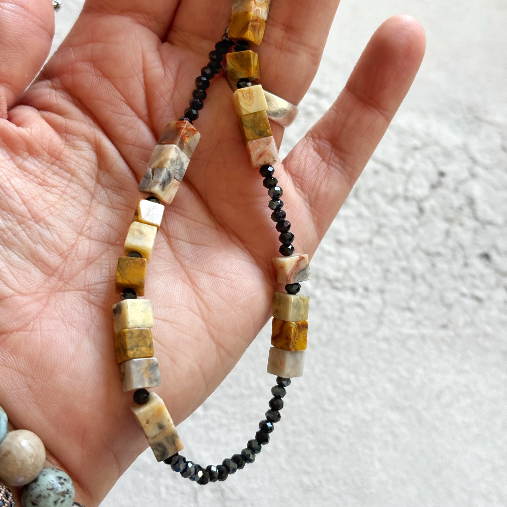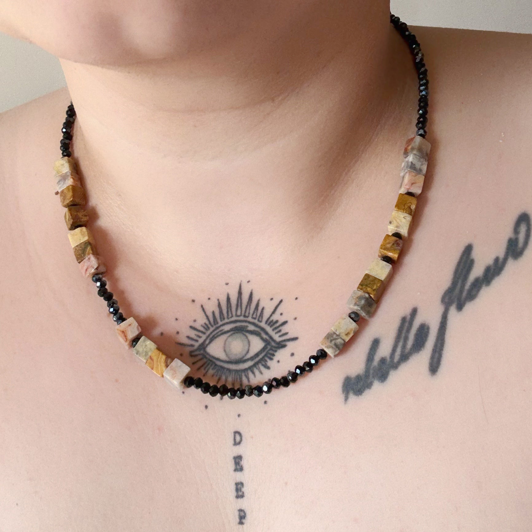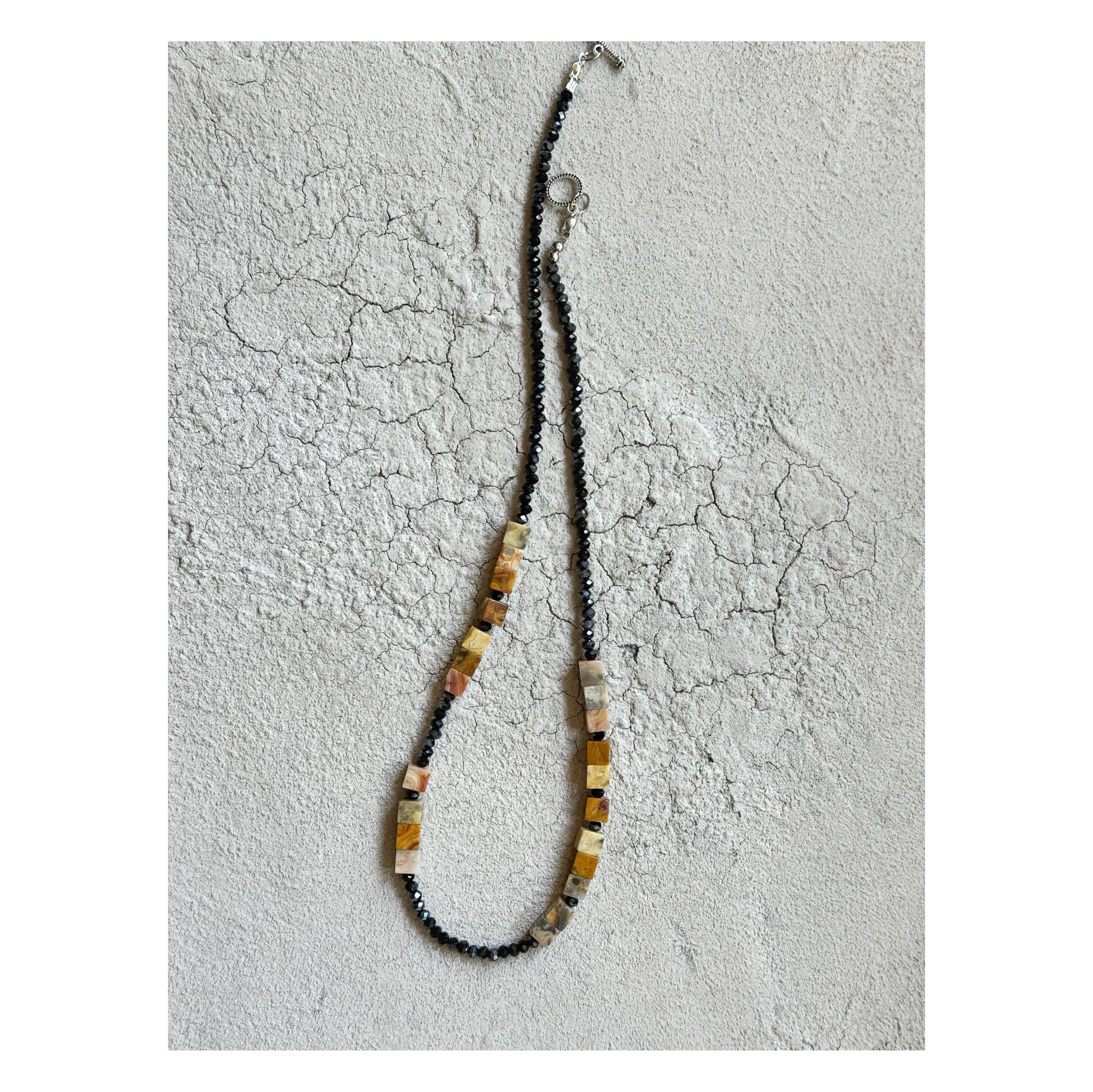 Šis elegantiškas vėrinys – tai natūralios jėgos ir subtilaus žavesio dermė. Derinami žemiškų atspalvių jaspio karoliukai, kiekvienas su unikaliu raštu, spinduliuoja stabilumą, įžeminimą ir vidinę ramybę. Prie jų priderinti blizgūs stiklo karoliukai suteikia lengvumo, šviesos ir subtilaus kontrasto.