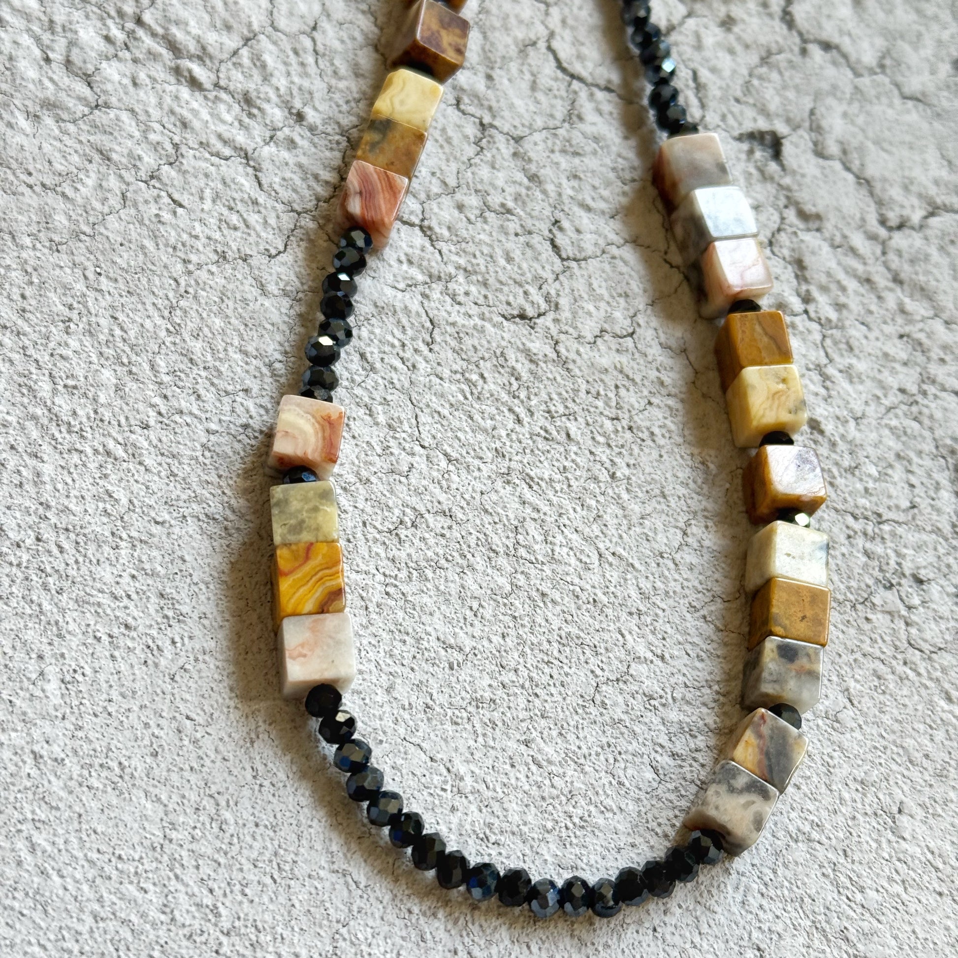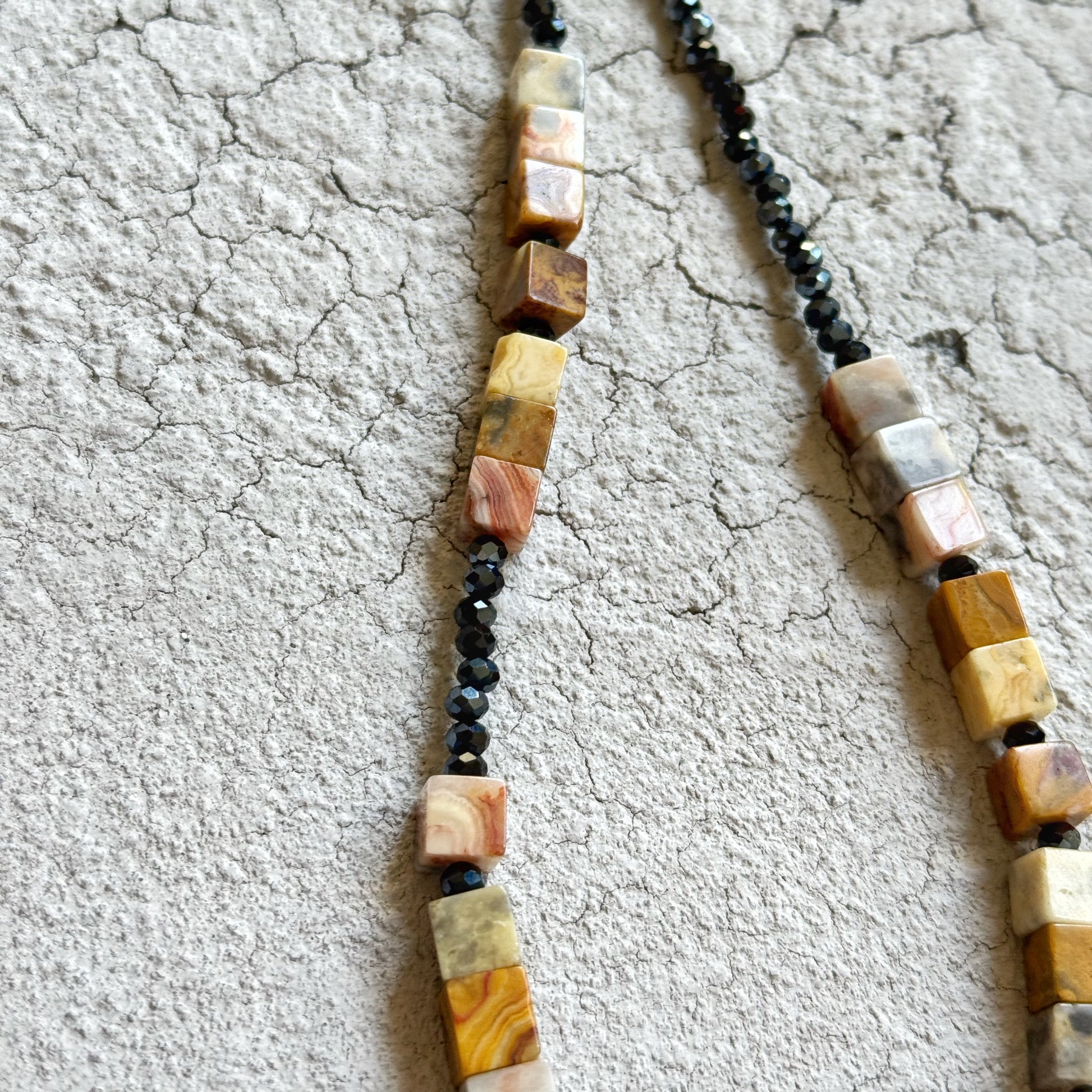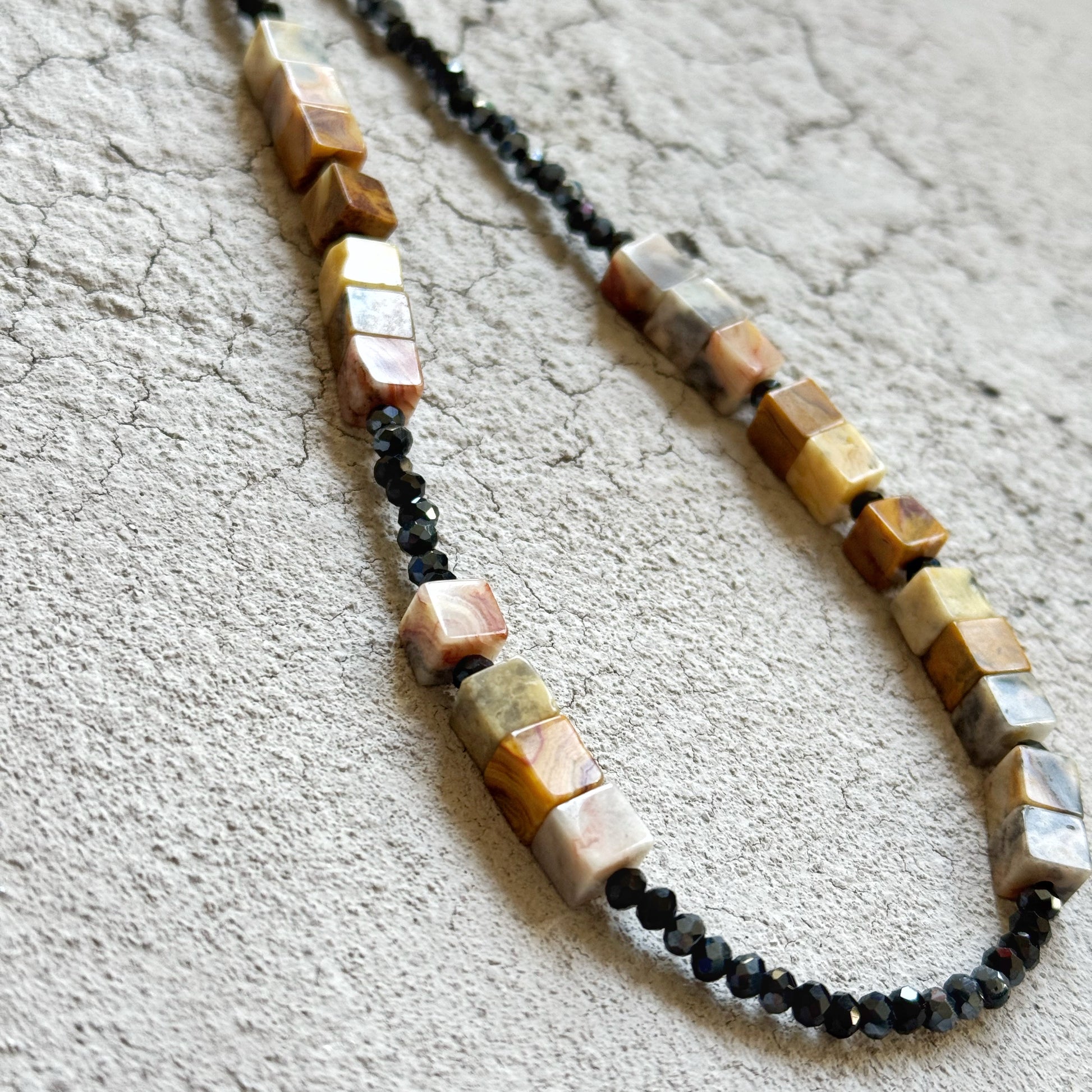 Šis elegantiškas vėrinys – tai natūralios jėgos ir subtilaus žavesio dermė. Derinami žemiškų atspalvių jaspio karoliukai, kiekvienas su unikaliu raštu, spinduliuoja stabilumą, įžeminimą ir vidinę ramybę. Prie jų priderinti blizgūs stiklo karoliukai suteikia lengvumo, šviesos ir subtilaus kontrasto.