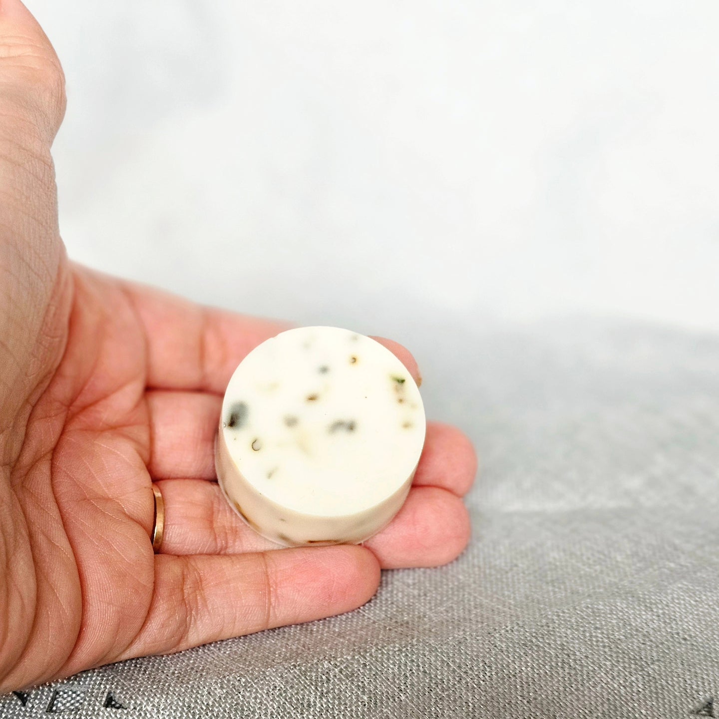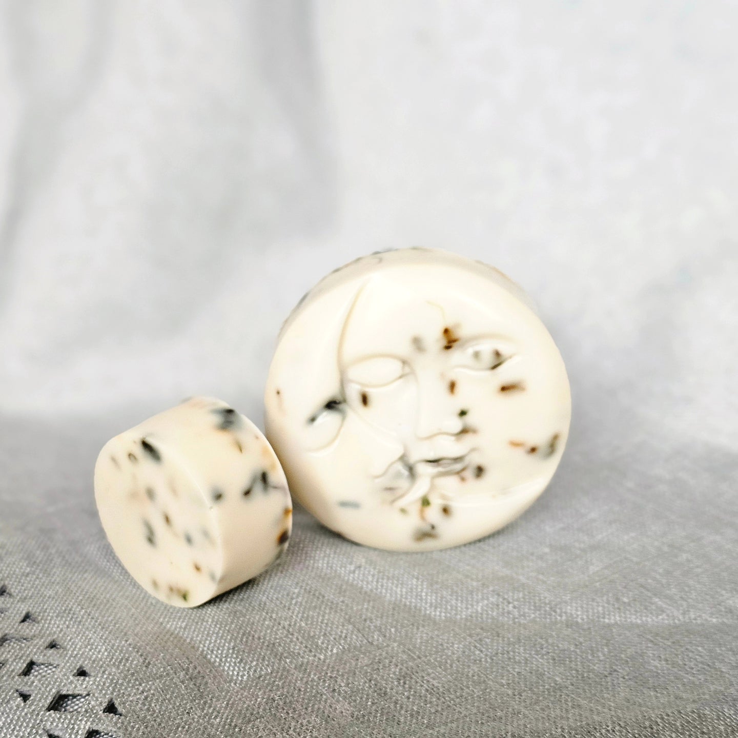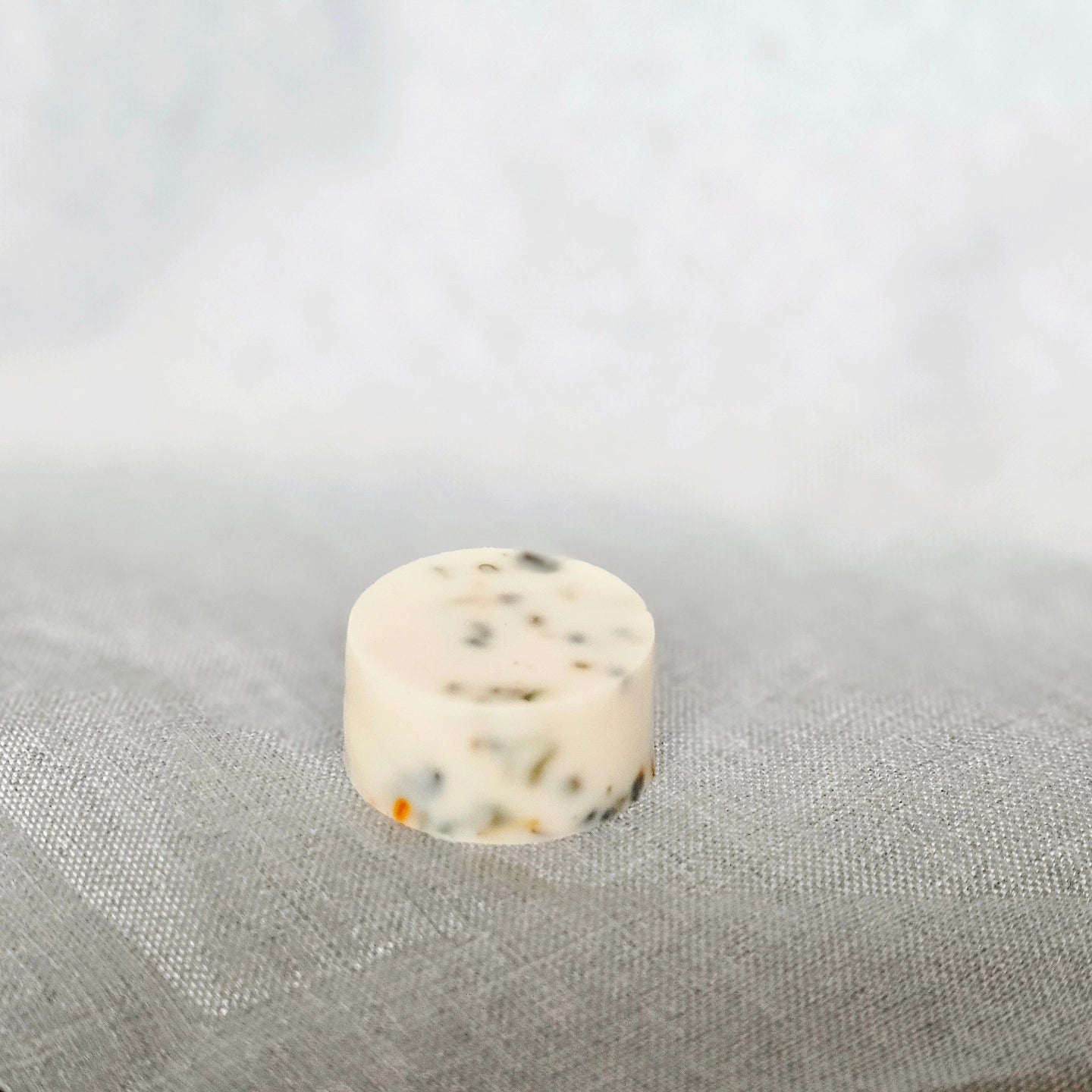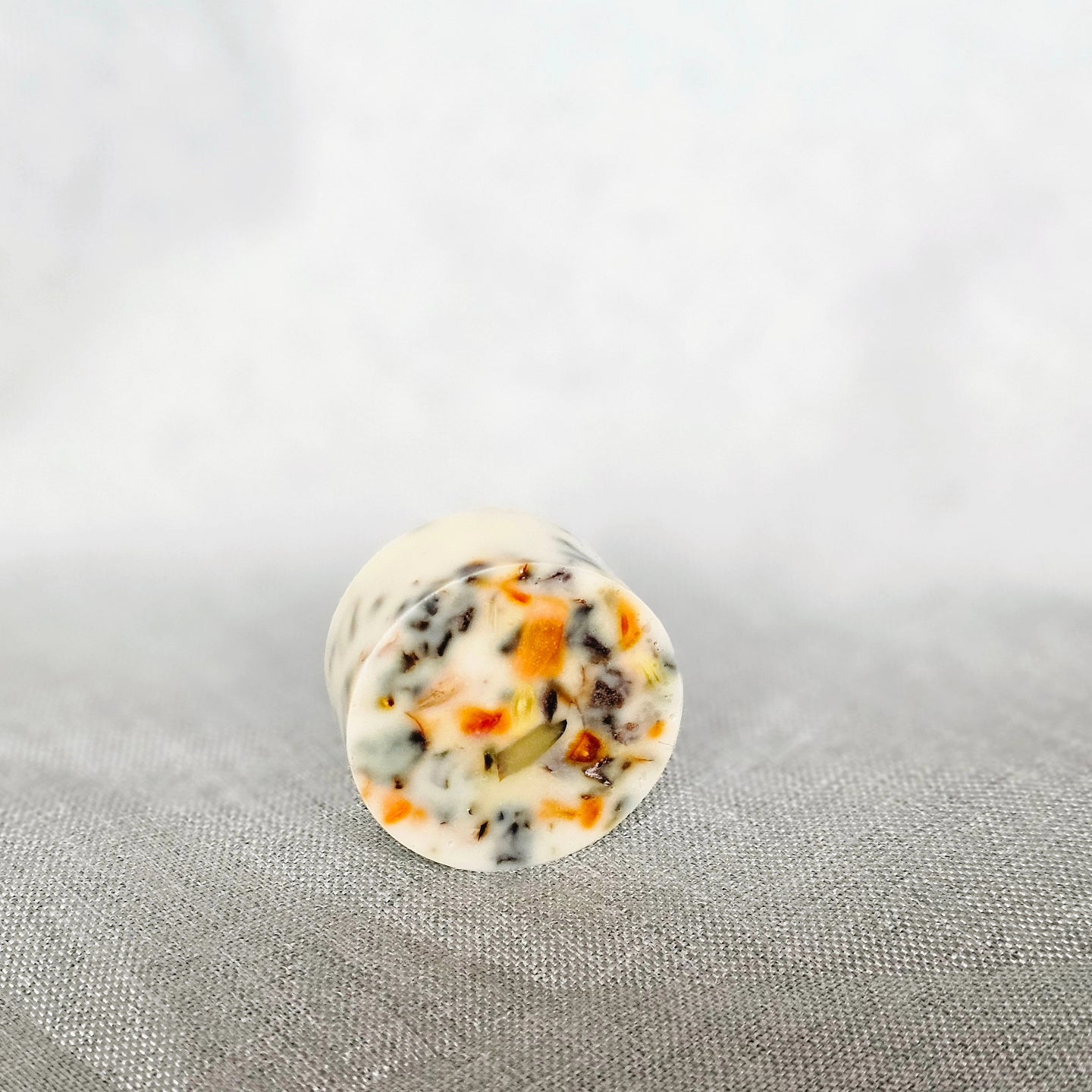 Rankų darbo natūralaus ožkų pieno muilo rinkinys su džiovintomis gėlėmis ir cinamono eteriniu aliejumi.