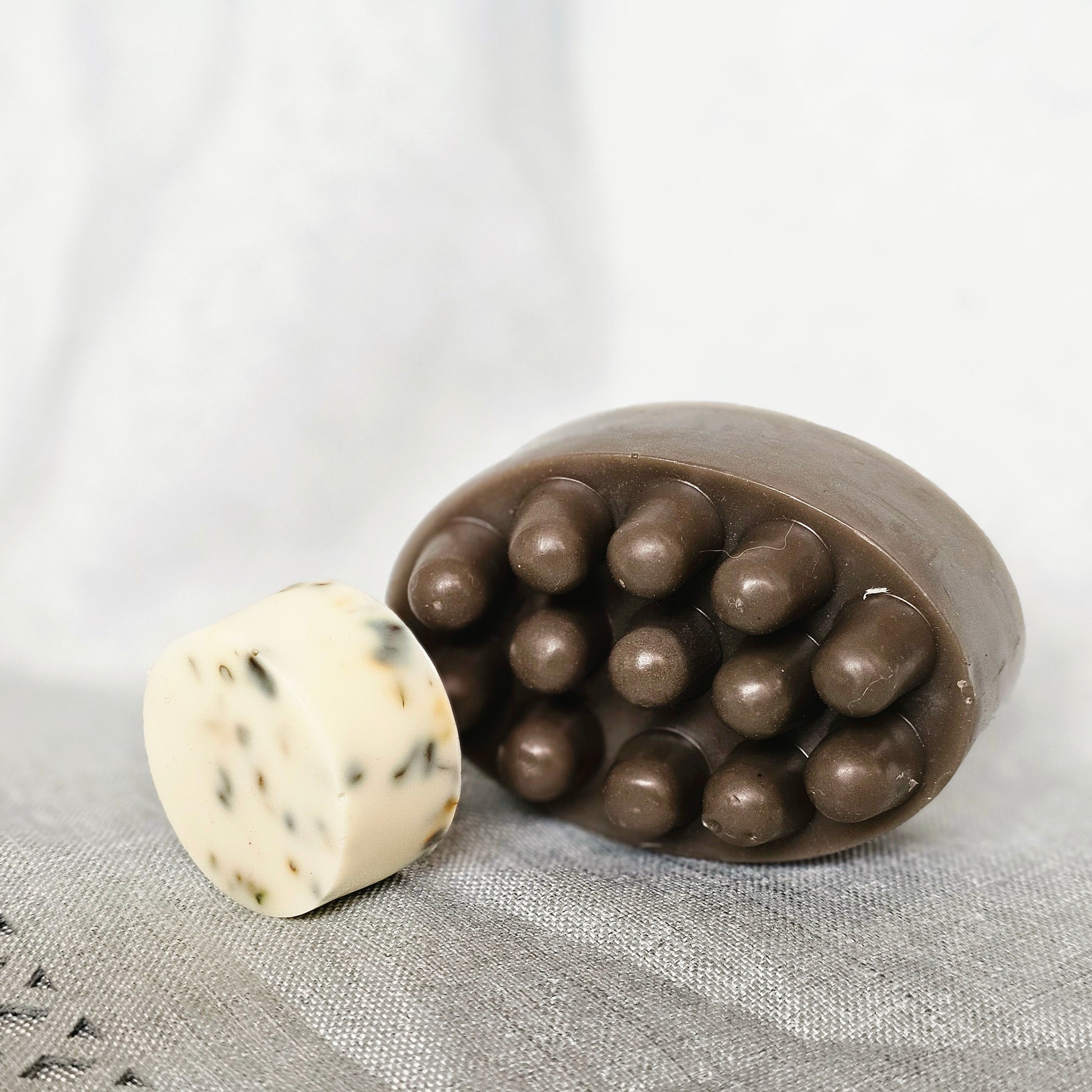 Rankų darbo natūralaus Izraelio Negyvosios jūros purvo ir ožkų pieno muilo rinkinys su džiovintomis gėlėmis ir cinamono eteriniu aliejumi.